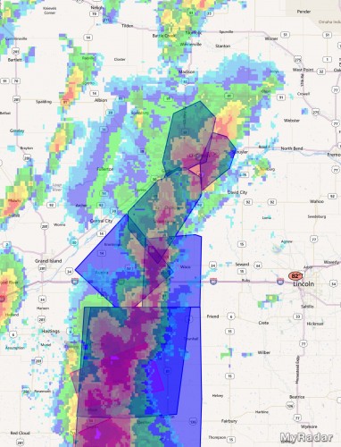 The graphic posted here is a screen capture off a weather radar app on my iPad – Yes, there is an app for that. The purplish-blue “boxes” each denote n active Severe Thunderstorm Warning area. As you can see there was quite a line of storms. We were fortunate to only get rain (gauge said 1/2″), wind, lots of cloud-to-ground lightning and the resulting thunder, but no hail. Many around us were not so lucky and hail golf ball size and larger was reported.