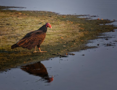 While out-and-about the other day we happened across a “committee” of Turkey Vultures feasting on some dead fish that had been left on the bank of a pond whose water had receded. After watching them feast on the fare for a while, one of the birds (seen here) flew off to be alone (Couldn’t stand the smell? of the fish or his compatriots?).