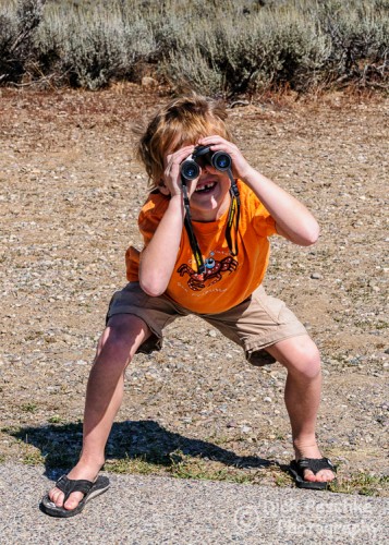One of the days we drove into Yellowstone National Park to view Old Faithful. At a quick stop to admire the landscape and my grandson was busy trying out a pair of binoculars. I think he had them attached to his eyes for the whole visit – inside, outside, in bed… you get the idea!
