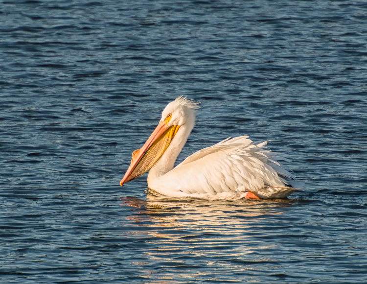 So, it was with great pleasure, that, arriving home from a day-trip to Lincoln, there was a lone pelican swimming in the lake in front of our house. It was late in the day and the setting sun was shining directly on the bird. It, with its breeding “horn-like plate” on top of its bill, swam back and forth posing for me (or maybe just teasing me) but it just wouldn’t come in for its “close-up.” This bird stayed until the sun was down and the light had faded. It returned briefly the next day, but I have not seen it since.