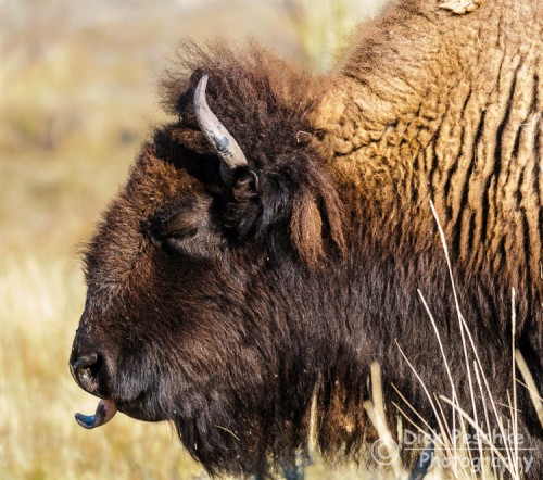 Today is a dreary, cloudy, drizzly day here in NE so I am at my desk working through the large collection of shots from our Wyoming trip. As I said above, Yellowstone has lots of Buffalo, so I have lots of pictures of Buffalo – individuals, families, herds, territorial disputes. Here is just one of the more fun pictures. The grass he was grazing on must have been fabulously good!