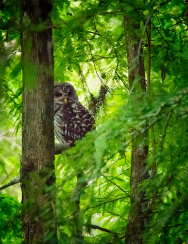 A VERY GOOD PICTURE OF THE OWL. EVA AND I WENT OUT INTO THE BIG SWAMP NEAR WAYCROSS ,GA . THE GUIDE SAID THERE IS NO MORE LONESOME SOUND THAN A BOATER LOST AT NIGHT HOLLERING FOR HELP . [THEY RENT BOATS FOR BOATERS TO FOLLOW MARKED TRAILS ] BUT IT ALL LOOK VERY MUCH THE SAME. THAT IS HOT ,HUMID COUNTRY. CHARLIE