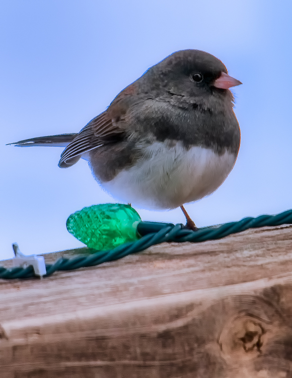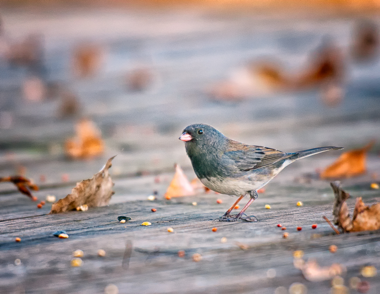 We usually see large numbers of birds at our feeders, but that’s not the case. I blame 3 cats that seem to have added our yard to their daily walk about. Yesterday, however, I saw a small number of Dark-eyed Juncos on our deck, in the pine tree and scratching for food under the feeders where the squirrels had made a mess.